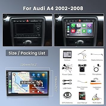 Android Car Stereo for Audi A4 2002-2008,Wireless Carplay Android Auto Car Radio,2G+64G 9’’ Touch Screen Head Unit with GPS WiFi Bluetooth Mirror Link FM RDS Backup Camera Mic
