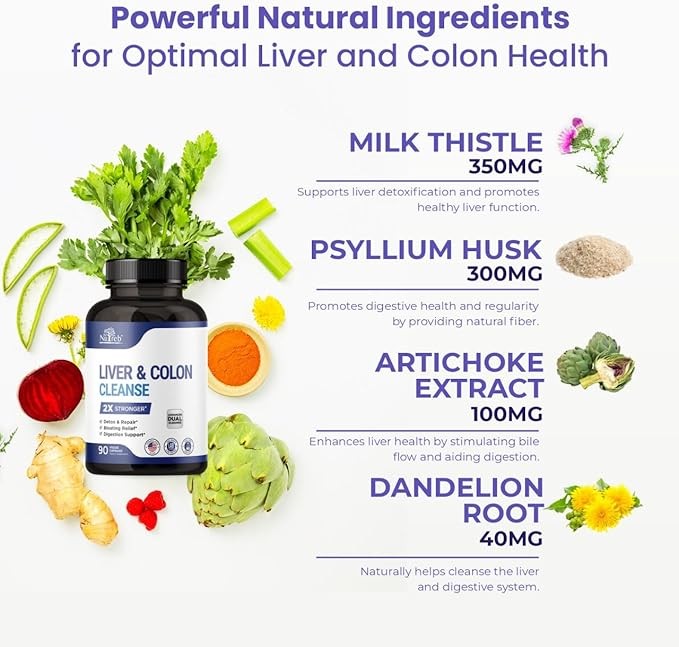 Liver Detox & Colon Cleanse - 2X Stronger Cleanse - Liver Cleanse Detox & Repair - Colon Cleanser & Detox - Premium Liver Support Supplement - Men & Women - Vegan 90 Capsules