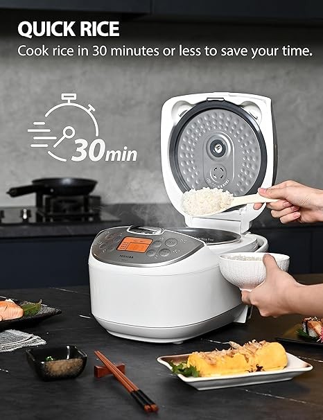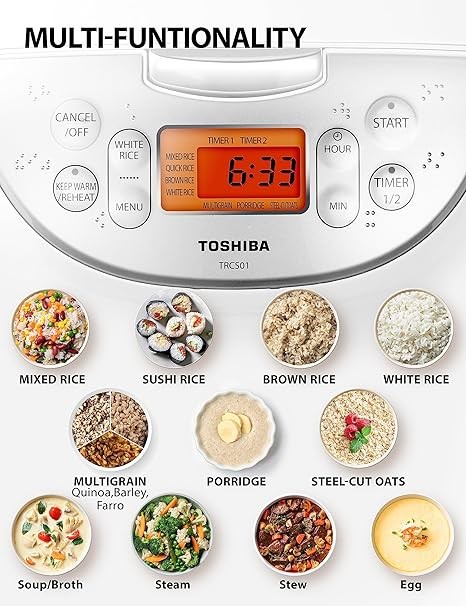 Toshiba Rice Cooker 6 Cup Uncooked – Japanese Rice Cooker with Fuzzy Logic Technology, 7 Cooking Functions, Digital Display, 2 Delay Timers and Auto Keep Warm, Non-Stick Inner Pot, White