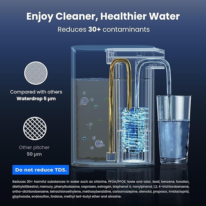 Waterdrop Slim Alkaline Water Filter Dispenser, Large 35-Cup with Electric Water Filter Pitcher, Dispenser 15-Cup, Blue, with 1 Filter, Does not Lower TDS