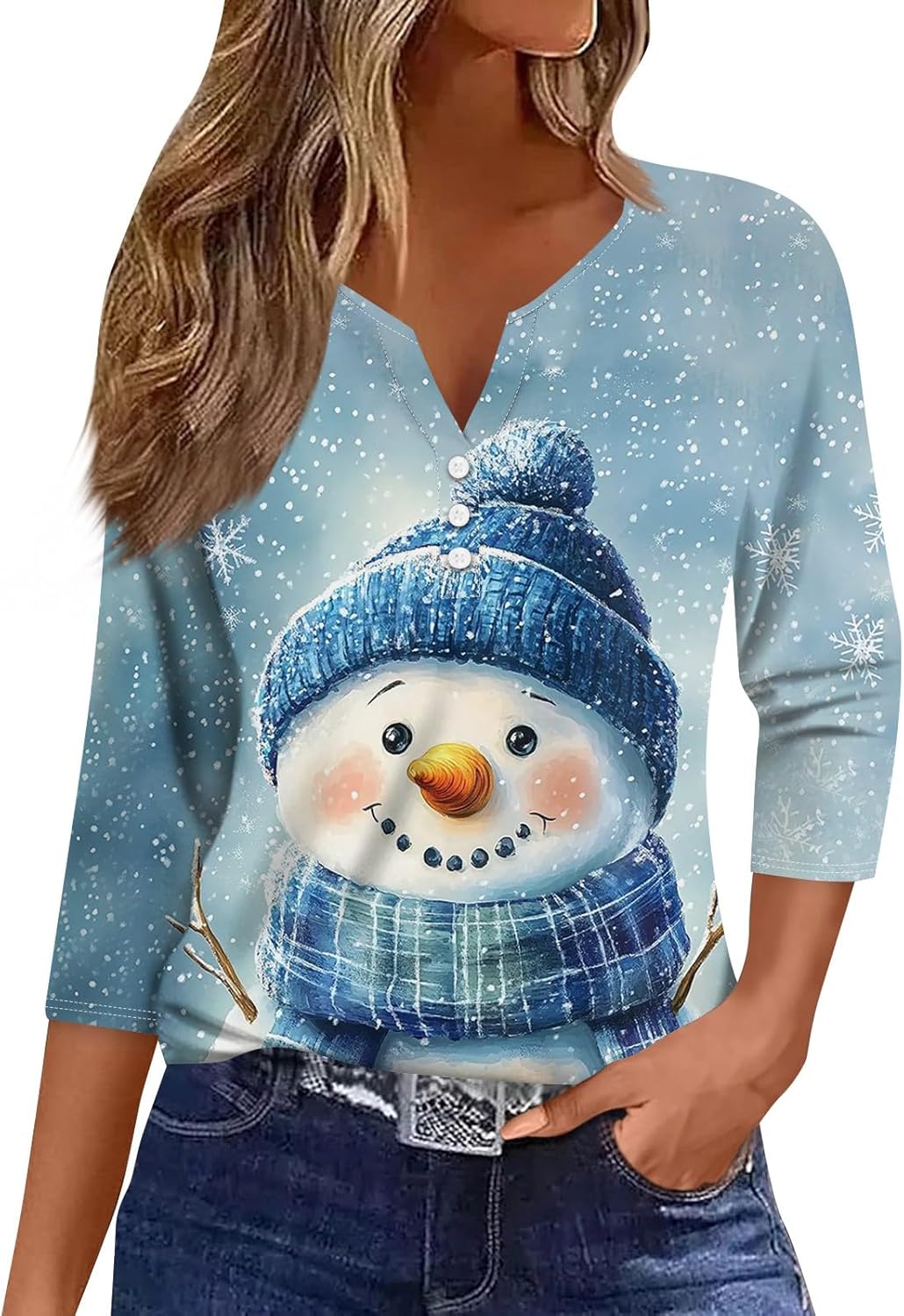 Women's Christmas Shirts 3/4 Sleeve Button V-Neck Tops Casual Loose Xmas Graphic Tees T-Shirts Holiday Outfits