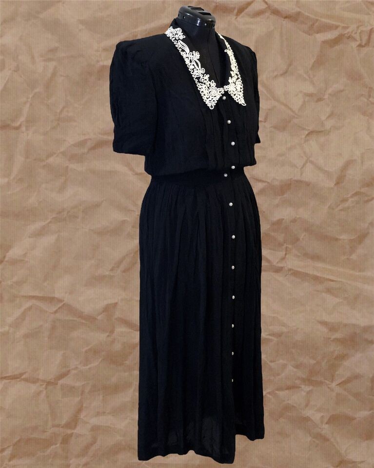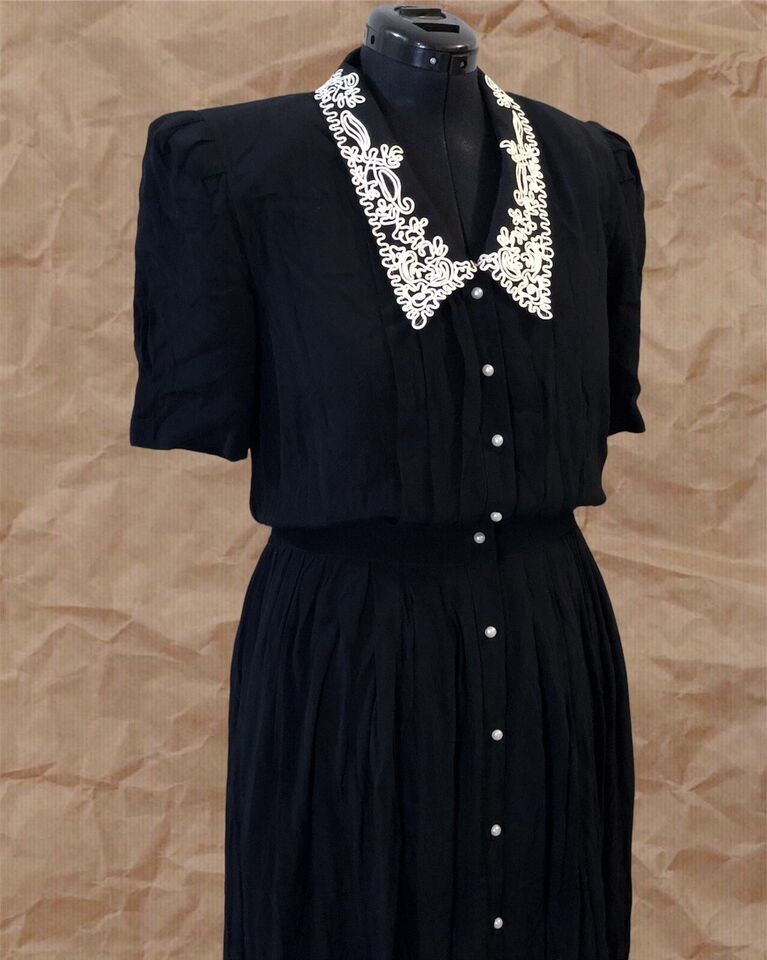 Women’s Vintage Karin Steven Black White Embroidered Collar Midi Dress US Size L